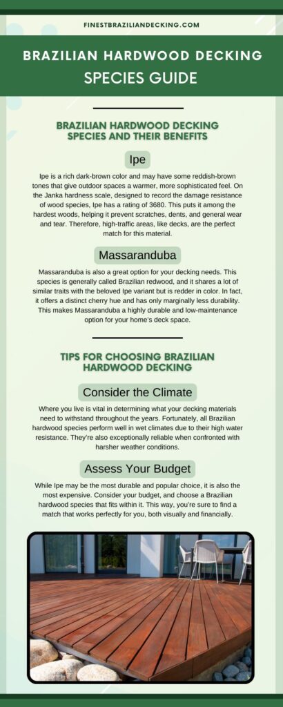 While Ipe may be the most durable and popular choice, it is also the most expensive. Consider your budget, and choose a Brazilian hardwood species that fits within it. This way, you’re sure to find a match that works perfectly for you, both visually and financially.