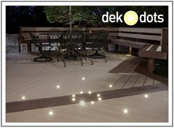 Dek Dots™ are a fantastic, new, inventive idea in LED Deck Lighting and LED Patio Lighting. These LED lights are great! DEKOR has introduced the smallest, brightest and easiest LED deck light for you to install in your outdoor living space that you will ever come across. They are available in convenient kits of 8 lights or separate 4 packs. You can add to your 8 light kit, it has the capacity to light 30 of our LED lights. Dek Dots install flush in any surface from wood to concrete or pavers and are designed to be walked on!