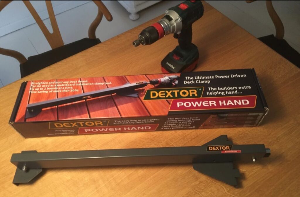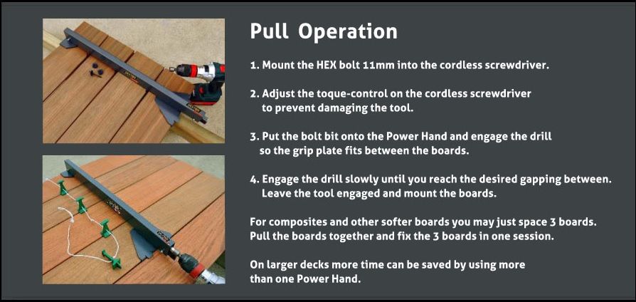 Our New Power Hand is a powerful deck tool that is designed to save you time by increasing the efficiency of your deck installation. This great new tool can straighten and hold any deck board, can be used on multiply deck boards if needed and is tightened with your power drill!