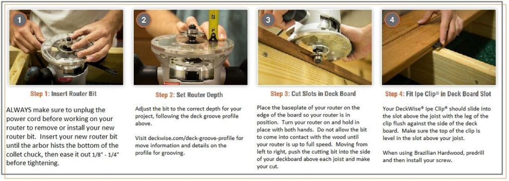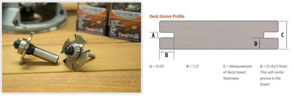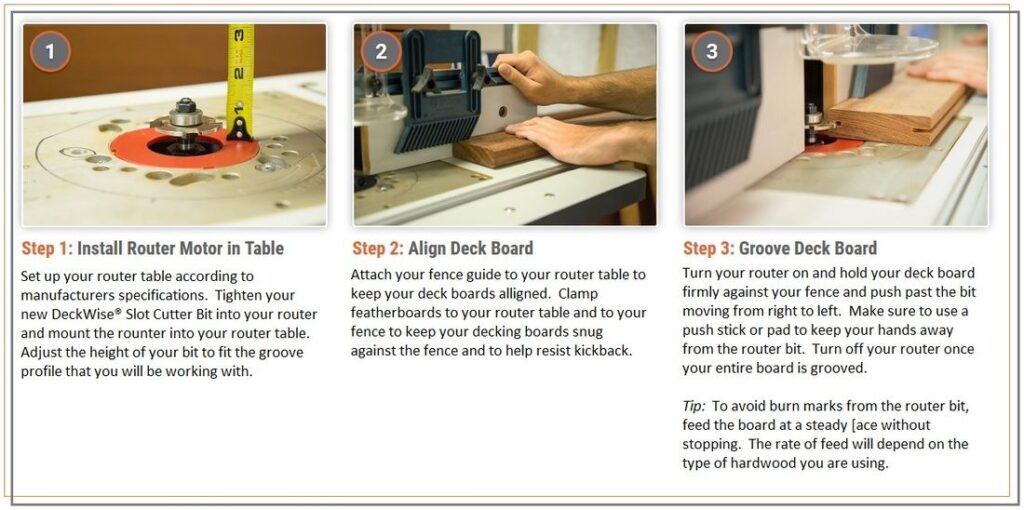 The DeckWise® Deck Board Slot Cutter is a router bit which has been specially designed for biscuit style hidden deck fasteners and on-site groove cutting.